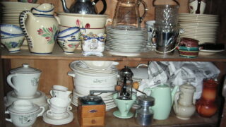 食器・キッチン品 食器類がごちゃごちゃと… 建物の屋根裏は、三角に組まれた何本もの柱がむき出しになった天井のだだっ広いスペース、そして天井もそれなりに塗装されて小さな天窓がついた10平方メートルくらいのスペースに分かれている。この小さなスペースに置かれていた古い木製の食器棚。上段と下... 2025.08.30 食器・キッチン品