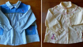 義母は、こんなものも仕舞っていた。夫が保育園か幼稚園で着ていたと思われる「うわっぱり」。なんと、60数年も前の品物だ。私の幼稚園時代も、丸襟でグレーの無地でできた「うわっぱり」をみんなお揃いで着ていたっけ。青と白のギンガムチェックは、胸元に...