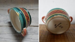最近、すっかり金継ぎづいちゃって〜。直径が10センチ足らずの丸い口の小さな器。両側に持ち手の「耳」がついている。これもカンペール(Quimper)で製造されたもので「HB」のサインが入っている。これまで紹介したカンペール陶器は、花柄だったり...