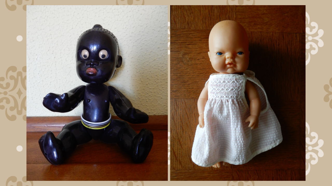 フランスでは、黒い肌色の赤ちゃん人形が売られていることは別に珍しくない。そのほかの人形と同じように、可愛い服を着て、愛らしい表情で陳列台に並んでいる。バービー人形だって、黒人のキャラクターが存在する。ただ、だっこちゃんもそうだったように、お祖母さんの人形も当時はちょっと物議をかもしたかも。人種の特徴をことさらに強調しているというような理由で人権問題に発展したんじゃないかなぁ。