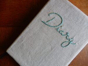 それでも、最近、ちょっと刺繍をしてみた。私は、「3年日記」という3年間使える日記帳を利用している。3年分、同じ日が同じページに並ぶことになるので、ちょうど1年前に何があったとか、何をしたかがわかるのは新鮮で、1年前の自分を振り返るのは面白い。3年使うので表紙が傷むかもと思い、布カバーを縫って、表紙側に「Diary」と刺繍した。