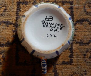 カンペールの陶器産業は1708年、ブスケ/ラ・ユボディエール(Bousquet/La Hubaudière)の家族からはじまった(通称として「HB」が使われる)。その後、いくつかの陶器製造所が誕生したが、名の知れたところでは19世紀半ばから台頭したアンリオ(Henrio)家。しかし、ふたつの戦争を経て、陶器産業は景気がいちじるしく下降。1969年にはHBとアンリオが合併し買収され「HB-Henrio」になるが、2011年、再建型破産手続きにいたる。新たな経営者のもと、「アンリオ・カンペール(Henrio-Quimper)」が設立され、これがカンペール唯一の陶器製造ユニットとなった。(以上、Wikipédiaからカンタンまとめ!)