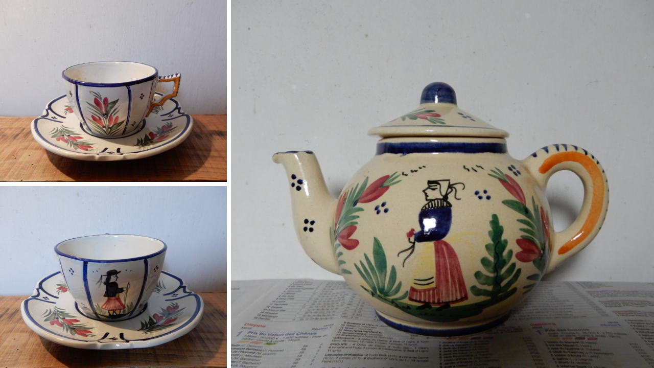 屋根裏にあったティーポットと揃いのふたつのカップは、ブルターニュ焼き独特の色合いの手描き絵付け。花と民族衣装の男女がモチーフだ。上のカップの反対側にはポットと同じ女の人が描かれている。
