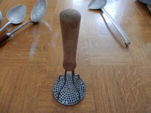 そして、ジャガイモつぶし器。この形のものは、今でもステンレス製が売られている。茹でたジャガイモを押しつぶすと穴からニョロっと芋が出てくる仕掛け。料理にうるさい人は、粒々がまだ残っているじゃないかと言うかもしれないが、その粒々が手作り感いっぱい。鍋に牛乳と一緒に入れてかき混ぜながら温めたら、最後にバターとナツメグを入てマッシュポテトの出来上がり!