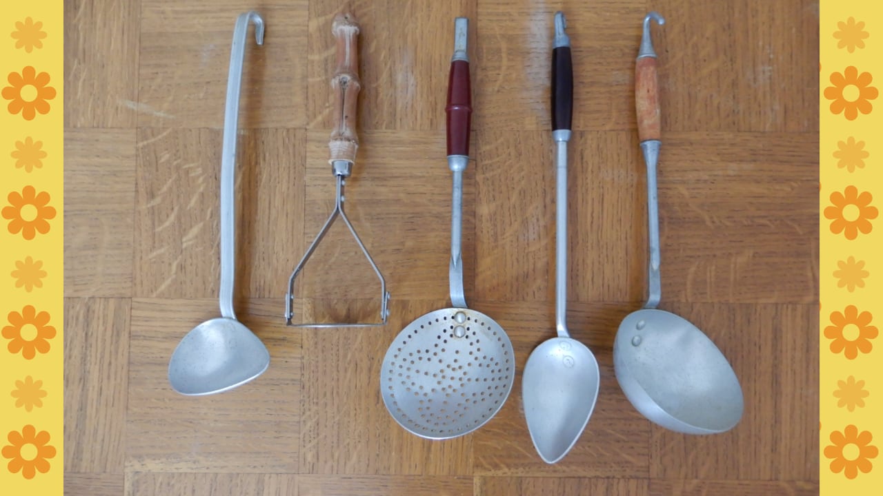 それとは別に、写真のアルミのお玉やジャガイモつぶし器は、義母がこの家で暮らしていた当時に日常的に使っていたもの。今は、私が愛用している。右端のお玉は大きくて、ちょうどスープひとり分。次のは、持ち手が長く、煮込み料理なんかを鍋ごと食卓に置く時に重宝している。穴の空いたお玉は大型で、マカロニや一口大の野菜を茹でた時にさっとすくえる。日本でも販売されているのかなと調べたら、似たような商品に「細かい揚げカスもキャッチ!」と書かれていた。一番左端は、先がツンと尖ったお玉が持ち手に対して垂直に付いているもので、これまでスーパーのキッチン品売り場などでは見たことがない形。何に使うの?私は、具だくさんのスープを作ったりする時のアク取りに利用。