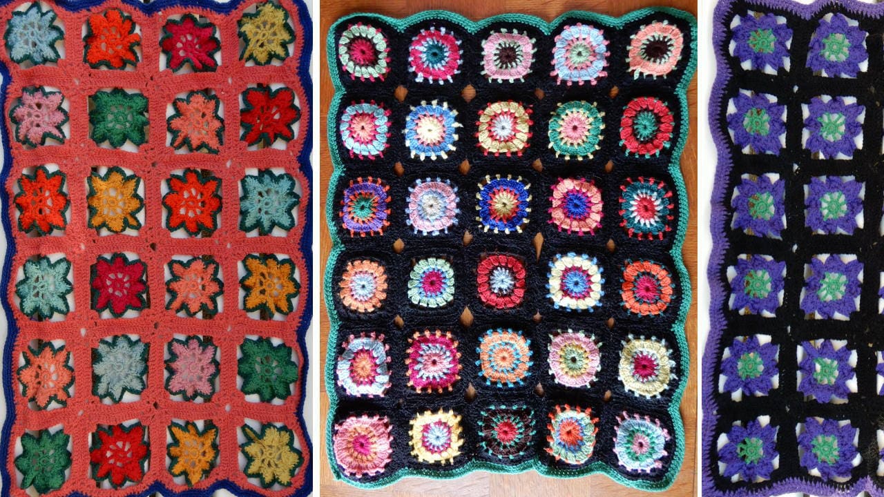 義母のモチーフ編みは、色とりどり。セーターなどを編んだ余り毛糸を集めて作ったのだろう。色合わせがなかなか上手い。古くて傷んだ物もあるが、彼女がさぞかし時間をかけて作り上げたのだと思うと、粗末にできない気持ちになる。