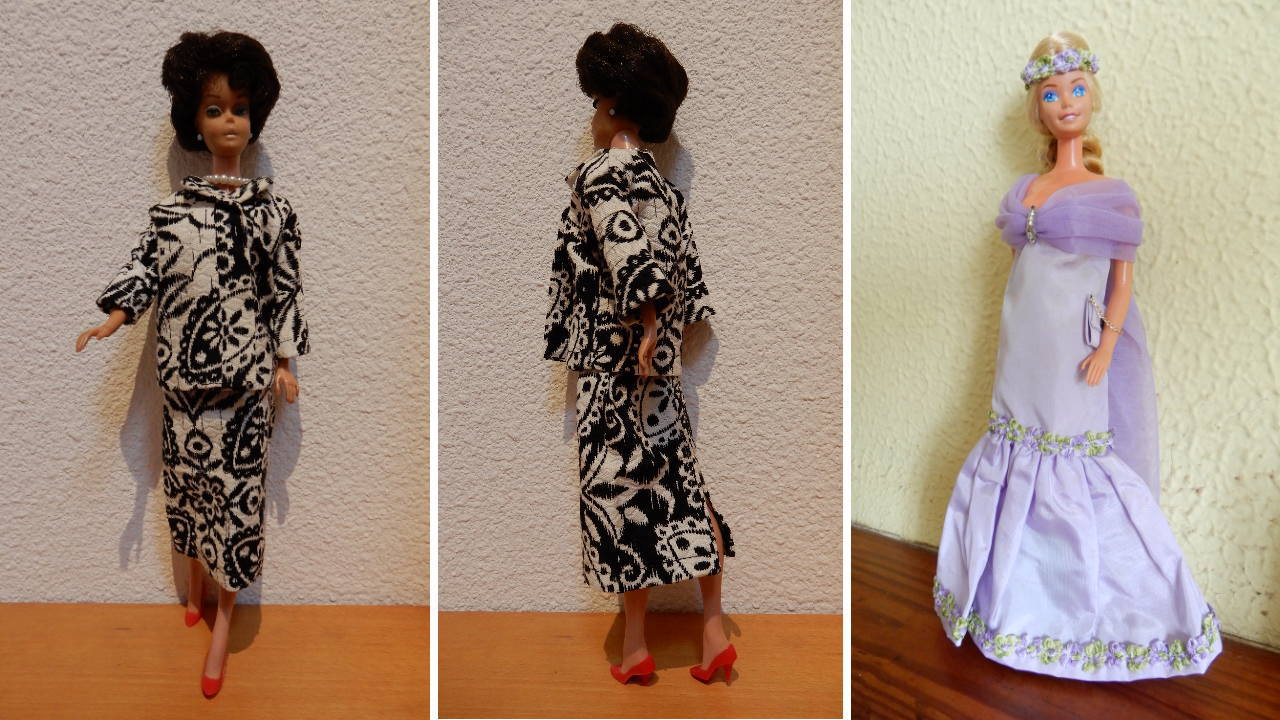 タイトルの写真は、義母が手縫いで作った白地に黒い模様のスーツを着たバービー。赤いハイヒールがスーツを引き立てて、私のバービーは後ろ姿もセクシーだ。白い歯を見せてニッと笑っている隣のバービーは、義母が持っていたもの。ドレスは元々着ていた既製服だと思われる。