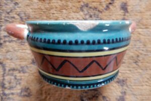 直径が10センチ足らずの丸い口の小さな器。両側に持ち手の「耳」がついている。これもカンペール(Quimper)で製造されたもので「HB」のサインが入っている。これまで紹介したカンペール陶器は、花柄だったり、民族衣装の人物が描かれたりだったが、こういった模様モノも多い。食器としては、花柄よりも使いやすそうな感じ。