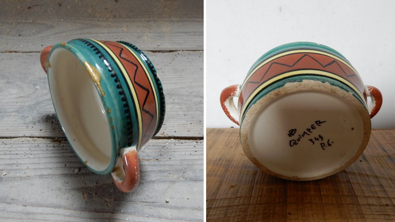 直径が10センチ足らずの丸い口の小さな器。両側に持ち手の「耳」がついている。これもカンペール(Quimper)で製造されたもので「HB」のサインが入っている。これまで紹介したカンペール陶器は、花柄だったり、民族衣装の人物が描かれたりだったが、こういった模様モノも多い。食器としては、花柄よりも使いやすそうな感じ。