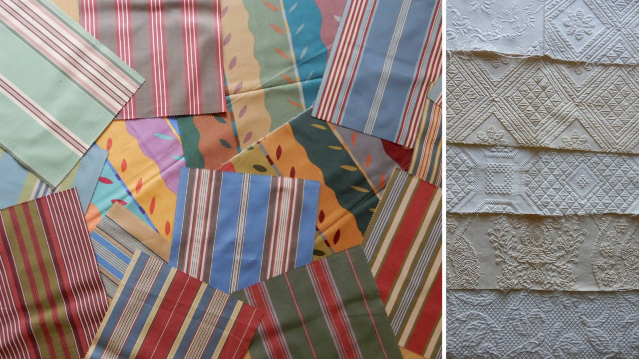 ソファーやカーテン、クッションカバーなんかを作るためのものなのか、布地がとてもしっかりしている。派手目の縞模様の生地は、ヴィンテージなソファーやひじ掛け椅子に向いていそうだ。ふくれ織りというのか、立体模様の白っぽい布はとても上品な印象だ。